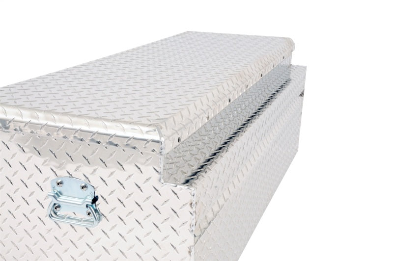 Dee Zee Tool Box - Red Label Chest. Constructed of heavy duty Brite-Tread aluminum. Crown style lid with a full pan double-V stiffener for superior rigidity. Convenient side handles for easy transport. Other features: lockable stainless steel paddle handles, dampened gas shocks, closed cell foam gasket, and self-adjusting strikers. Removable plastic tool tray to help keep small items organized.